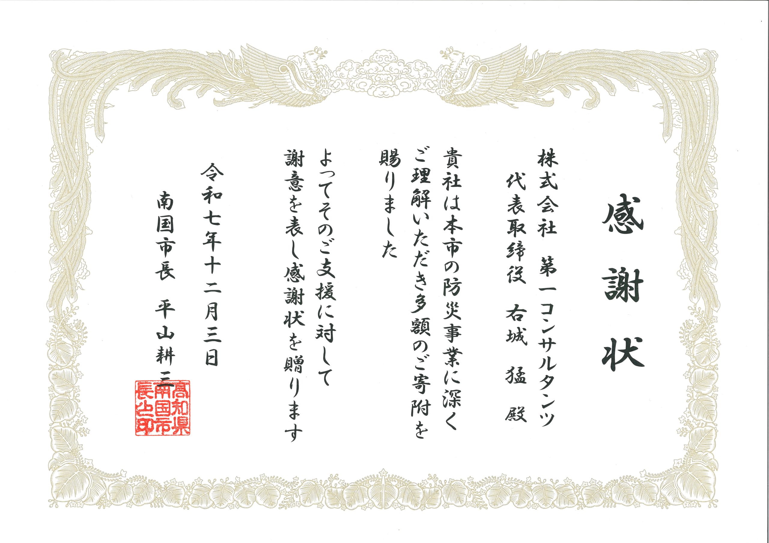 本日、南国市様から法人用ふるさと納税の感謝状を授与されました。これは地域貢献の一環として、南国市様に御礼の意味も込めて納付させて頂いたものです。わざわざ当社までお越し頂き、平山市長様自ら授与してくださりました。ありがとうございました。
