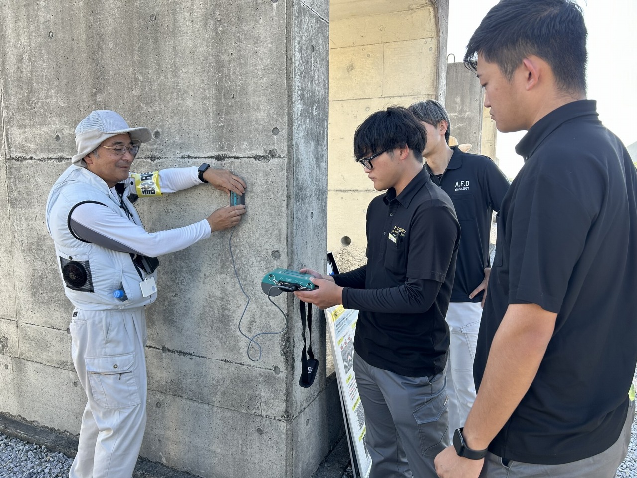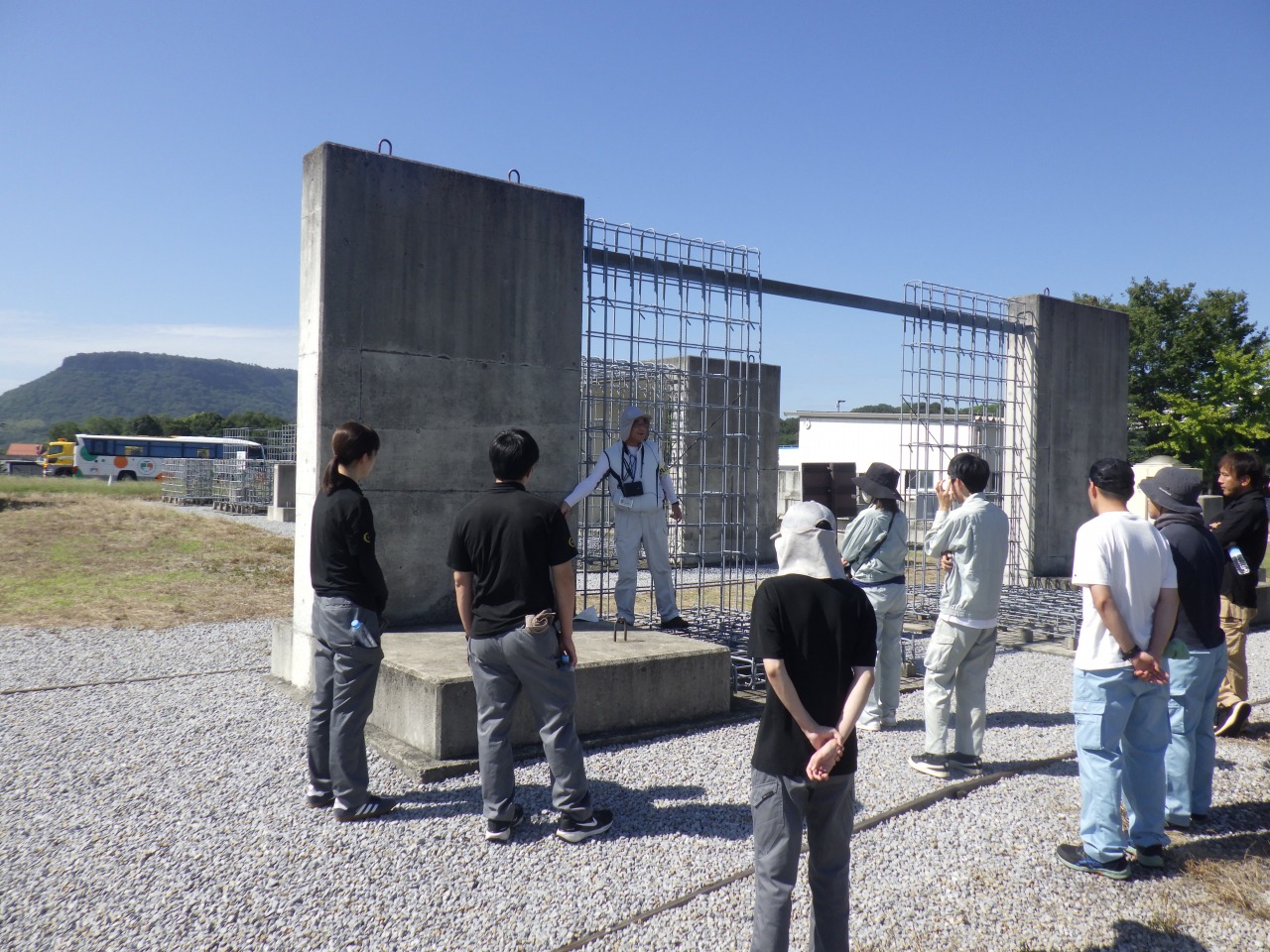 「土木構造物の実習施設での実習」では、実物大の擁壁や函渠、橋台を前に、土木構造物の品質確保の観点から、コンクリート打設や配筋における留意点などについて学ぶことができました。