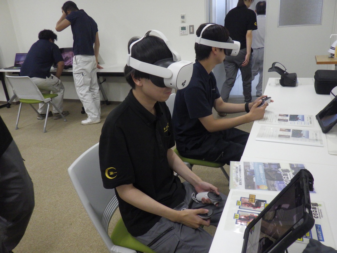 「インフラDX体験」では、LiDARスキャナで取得したデータをもとに、CADソフトを用いた自動断面図の作成や土量算出の説明を受けるとともに、ドローンシミュレーターやVRゴーグルを用いた仮想空間の体験、空間再現ディスプレイなどの最新のデジタル技術を実際に体験しました。
