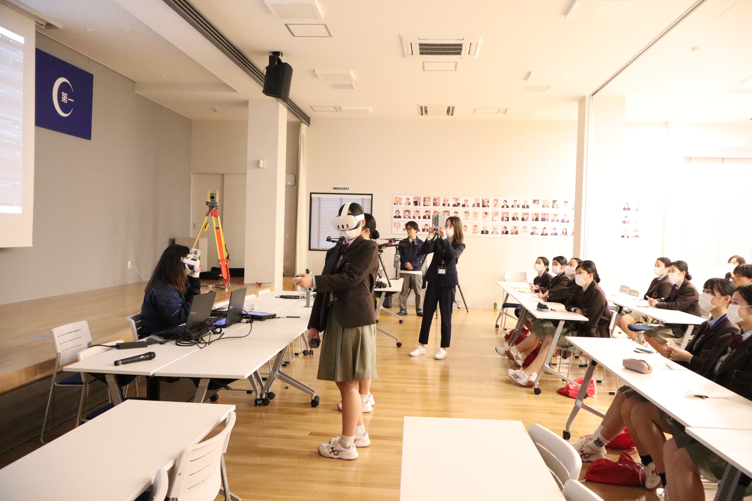 また、レーザスキャナや、UAV搭載のドローンを実際に見ながら説明を行い、最後には実際に現地にいるかのような画像が見えるゴーグル式のVDIを体感していただきました。